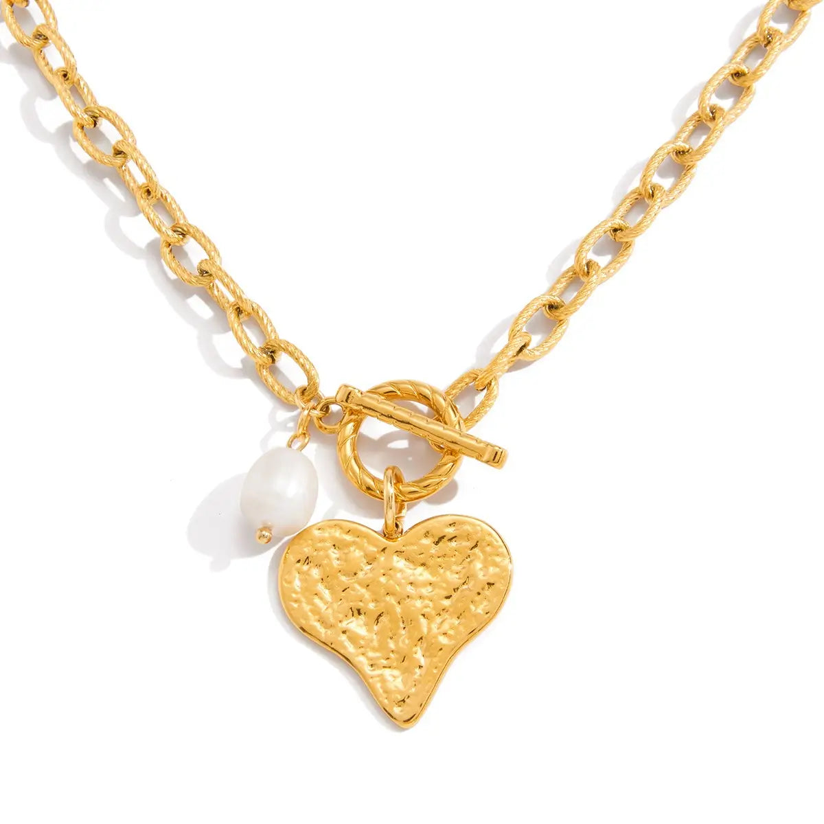 A classic heart necklace with a modern twist. This piece features a bold textured heart charm and a freshwater pearl, paired with a chunky chain and an easy to style toggle closure. It adds instant elegance whether you wear it with a simple shirt, a knit top or a dress.
