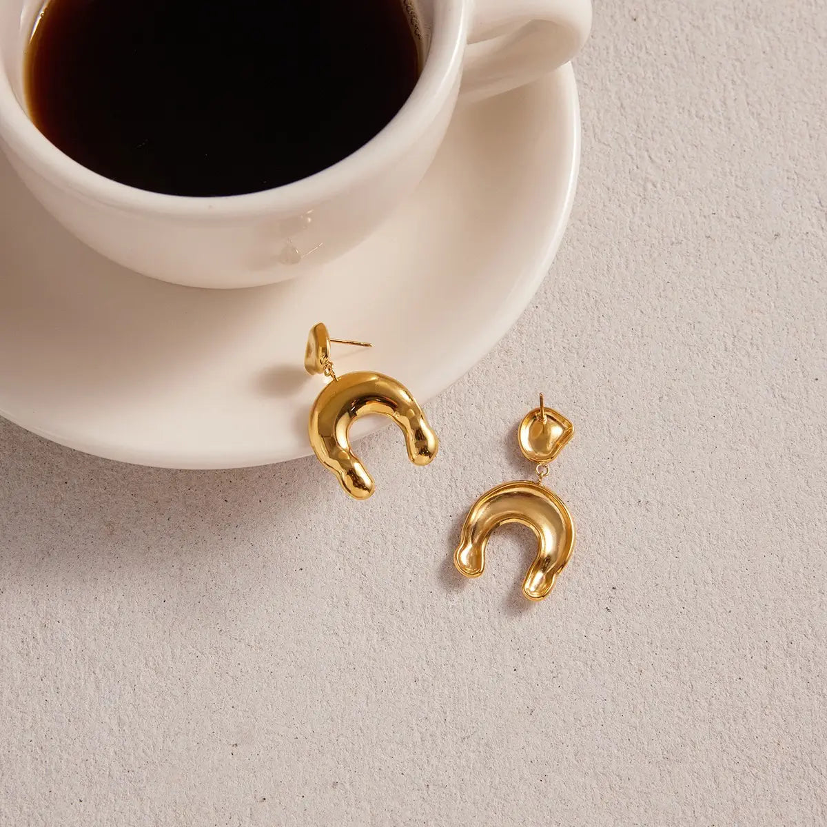Bold, sculptural, and impossible to ignore. The Molten Arc Earrings feature a smooth liquid–gold finish that creates a soft reflective glow with every movement. Each piece is designed with an organic top stud and a flowing arc drop that feels modern yet effortlessly wearable.