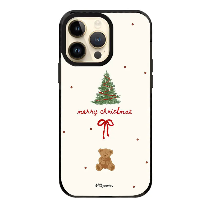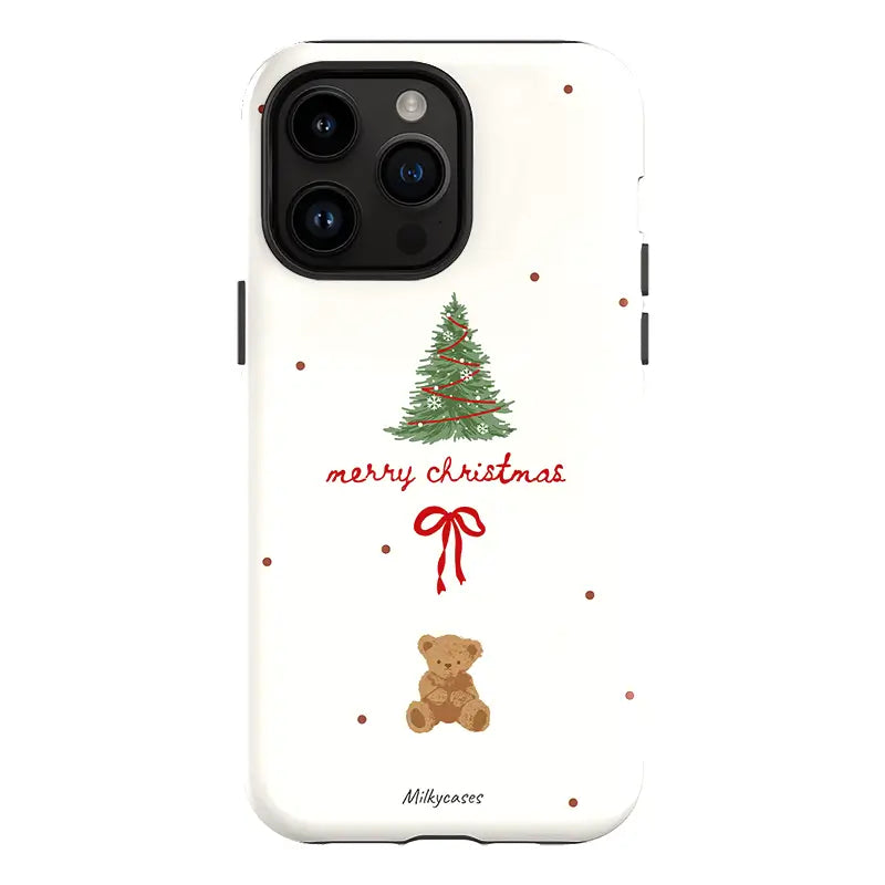 This design centers a ribbon-wrapped evergreen above the hand-lettered “merry Christmas,” sealed with a satin bow and a tiny teddy below. Soft cocoa dots sprinkle the warm ivory background like gentle snow, giving classic postcard charm with a cozy, giftable feel.