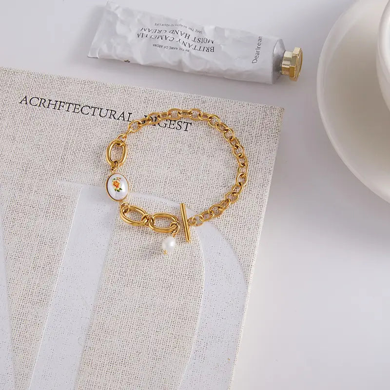 This bracelet mixes a vintage floral charm with glossy gold links for a soft and elegant look. The hand painted flower sits on a mother of pearl style base, paired with a small pearl accent that moves gently with your wrist. It is an easy piece to wear on its own or to stack with your everyday bracelets. If you like jewelry with a warm and feminine mood, this one feels timeless and special.